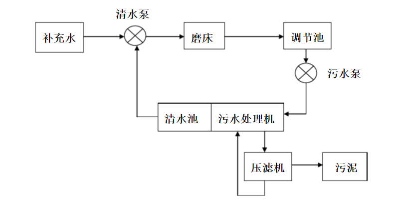 磨削工段的磨床在工作之時一般需要水作為冷卻劑,排出的冷卻水中含有磨料粉末及加工件的微小懸浮顆粒,冷卻水不經處理直接排放的話會堵塞管道、污染環境。